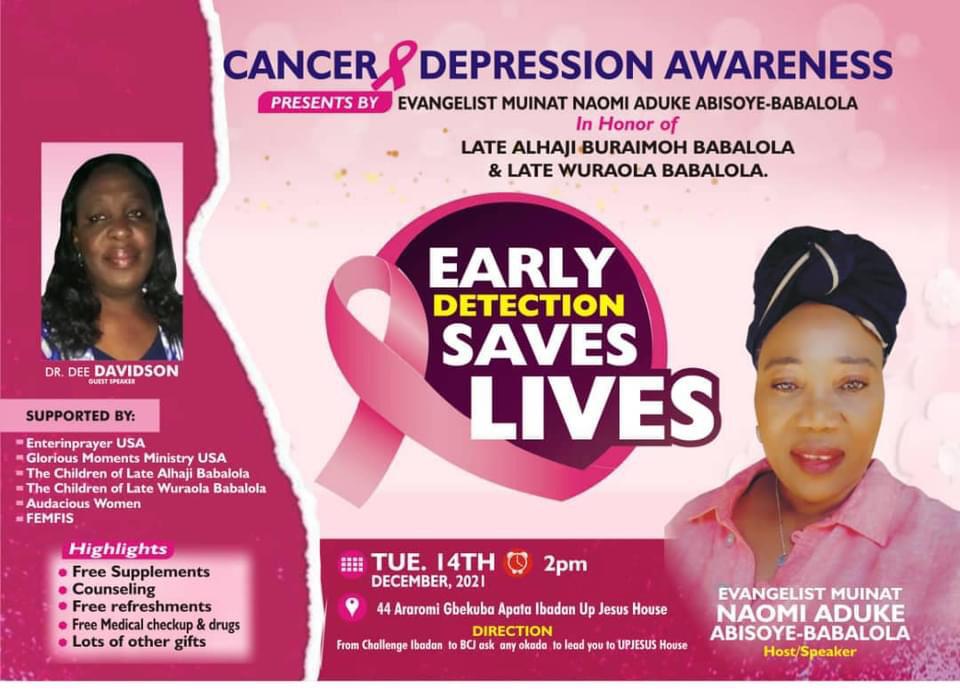 Join us in supporting Evangelist Muniat Naomi Aduke Abisoye-Babalola Outreach by donating today. Your donation will help us provide free counseling, supplements, medical checkups, and medications to those in need. Every little bit counts towards making a positive change in someone's life. Thank you for your generosity and support.